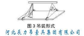 3.2  單板鉗與雙板鉗起吊鋼板時(shí),必須與橫梁配套使用,其中α在(45-90)°之間,β在(0-15)°之間。橫梁的有效長(zhǎng)度應(yīng)不小于鋼板長(zhǎng)的1/3。單板鉗或雙板鉗兩只試驗(yàn)為額定載荷,四只為一組吊裝作業(yè),吊運(yùn)過(guò)程中,鋼板應(yīng)保持水平見(jiàn)圖3。